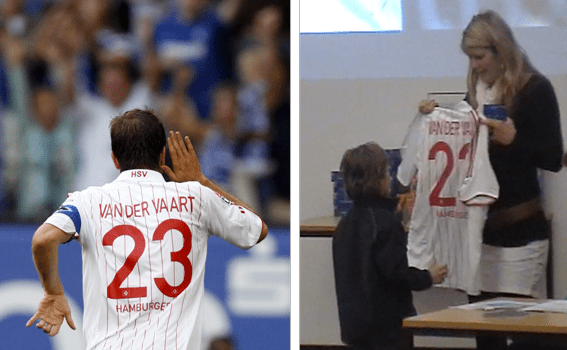 Im Hamburger Kontext klärt sich das einfacher auf: Es war die Rückennummer des damals für den HSV spielenden Fußballers Rafael van der Vaart! Da er zur Saison 2008/09 zu Real Madrid wechselte, konnte er ein Trikot mit seiner Rückennummer leider nicht mehr persönlich an den vor Freude strahlenden Erstklässler David J. aushändigen. Das und eine unterschriebene Autogrammkarte überreichte dann stellvertretender Weise die damalige HSV-Spielerin und zweimalige Europameistern mit der Nationalmannschaft der U19 Imke Wübbenhorst.